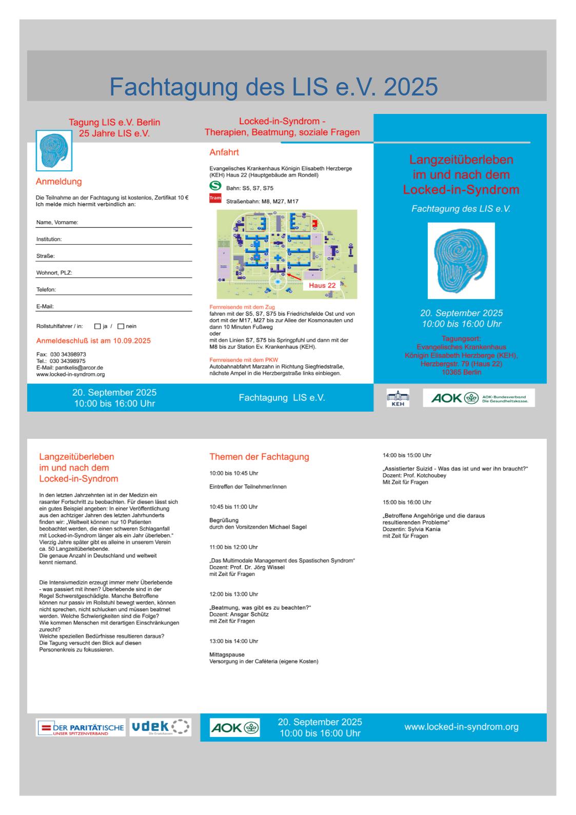 An drei Tagen im Oktober lädt LIS e.V. zum Fortbildungsprogramm „Das Locked-in Syndrom“. Mit Filmen und Vorträgen wird über eine besonders schwere Form des Schlaganfalls, die mit einer Lähmung von Kopf bis Fuß beginnt, informiert. Auch Sprechen und Schlucken sind nicht möglich. Eine Kommunikation kann lediglich über die erhalten gebliebene Beweglichkeit der Augen hergestellt werden. Zwei Beiträge beschäftigen sich mit den Grundlagen des Locked-in Syndroms, weitere Beiträge beleuchten die Kommunikationsmöglichkeiten, sowie die Selbsteinschätzung Betroffener. Zudem stellt sich der Verein LIS e.V., indem viele Patienten mit einem Locked-in Syndrom zu finden sind, vor.